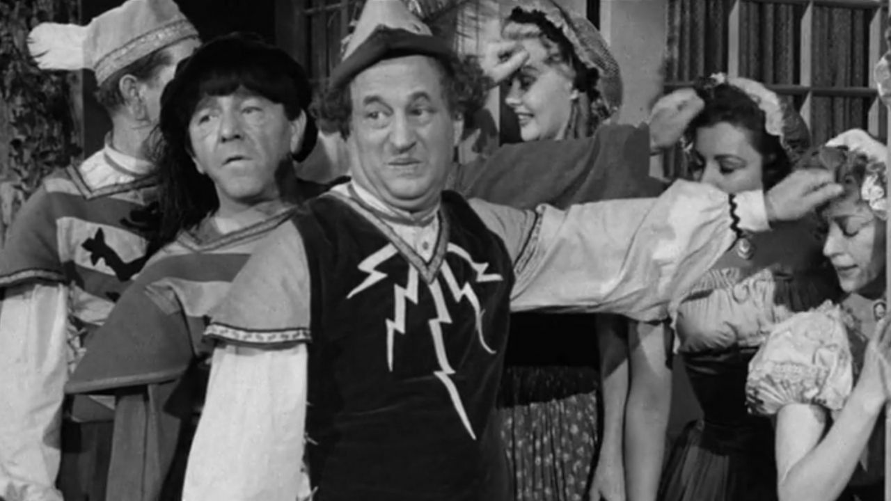 The Stooges are court fiddlers to the king and seek to marry Tillyeth, Millyeth and Lillyeth.