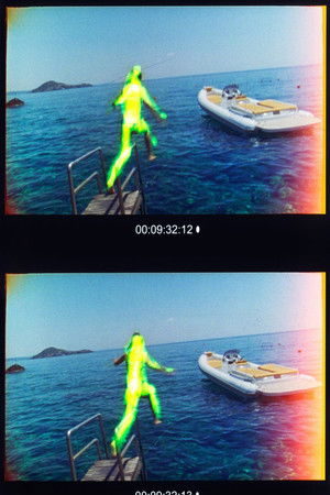 Lebon began filming soon after the end of a significant relationship. Following a desire to reflect on the nature of intimacy, loss and memory, he traveled to film couples and individuals from different countries, who were open to sharing the typically-private intimacies of their lives. The footage was later intercut with Lebon’s own personal travel and holiday footage and reworked through successive stages of bleaching, scratching, painting, melting and cutting. Lebon commissioned an engineer to customise a number of original die-cutting machines so that specific pieces of the animated frames could be cut out and interchanged with one another. Die Cuts is the result of over three thousand hours of analogue post-production processes.