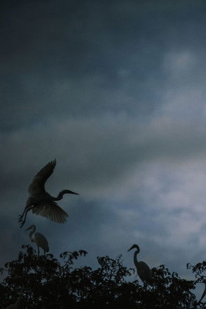 Great egrets gathered at sunset in arboreal dormitories.