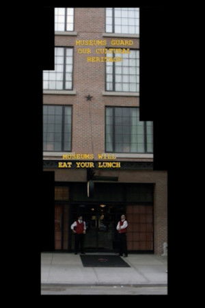 In this silent video, still images of stores and residential buildings in New York City appear within a cutout template, based on the “giftbox heap” formed by the New Museum silhouette. As these shiny storefronts, dwellings, and official documents of occupancy of the new Bowery in the 21st Century go by, set phrases relating to the merits and demerits of museums roll desultorily down from above to below.
