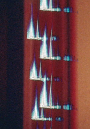 “In Drawings/Lines, 1971, on top of previously printed film—was he just recycling material or was he deliberately experimenting with a new technique?—Palolo scratched lines directly on the celluloid, imprinting on it a choreography of rhythms and lights. The background images, unified by an overall tone of blue and purple, fluctuate from barely visible to perfectly recognizable, producing a fascinating layered effect with material as diverse as Marlene Dietrich, the Beatles’ yellow submarine, Adolf Hitler, Botticelli’s Venus, and a painting by Magritte.” (Filipa Oliveira)