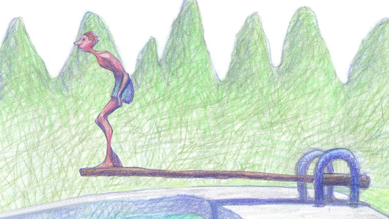 A man about to go swimming imagines what horrors could be lurking deep in in the waters of his backyard pool.