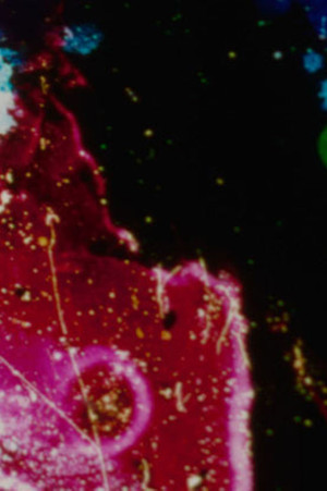 In this non-orange negative of a hand-painted film, a series of luminously pastel shapes – often patches of color against a stark white background – are interspersed with nearly black intermittent smudges punctuating white. These visual themes develop gradually into a series of multi-colored vertical lines which weave contrapunctally in relation to the flickering (single-frame) paint shapes. Twice, a solid (as if photographed) shape is seen receding from the amalgam of paint. Masses of tiny dots and "curlicue" shapes sometimes interrupt the thematic progression from irregular paint-shape flickerings to fluidity of vertical lines: this theme eventually resolves itself through the intervention of globular shapes (most notably, brilliant orange-yellow "globs") which spread themselves over several frames and prompt the eventual amalgamation of all themes.