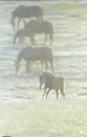 A loop of horses frolicking in the pasture.