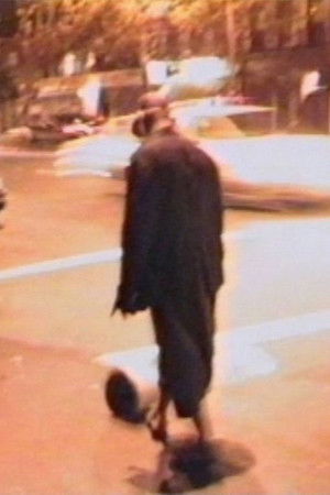 Phat Free begins with several minutes of darkness overlaid with an unidentifiable loud, metallic sound. As the video image is revealed, a man—Hammons himself—appears dressed in a long coat, felt hat, and sneakers, kicking a metal bucket down a deserted city sidewalk late at night. The work was shot in 1995 to document Hammons’s late-night performance and edited into an independent video work four years later. At first seemingly violent, the noise evolves into an almost musical rhythm that is synchronized with the protagonist’s methodical movements. The title elaborates this musical allusion, conjuring both the streetwise lyricism of rap and hip-hop and the improvisational nature of jazz.
