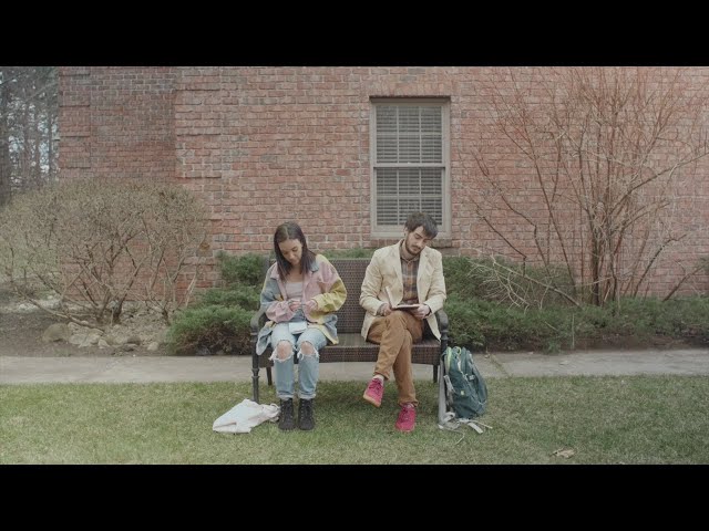 A girl begins to write but finds her pen is out of ink. She turns to the man next to her and asks if he has a pen she can borrow.