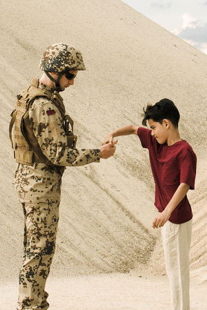 In a therapy session a traumatised veteran dwells on a boy from his past. Based on propaganda photographs of soldiers playing “thumb war” with children in countries they invaded and occupied.